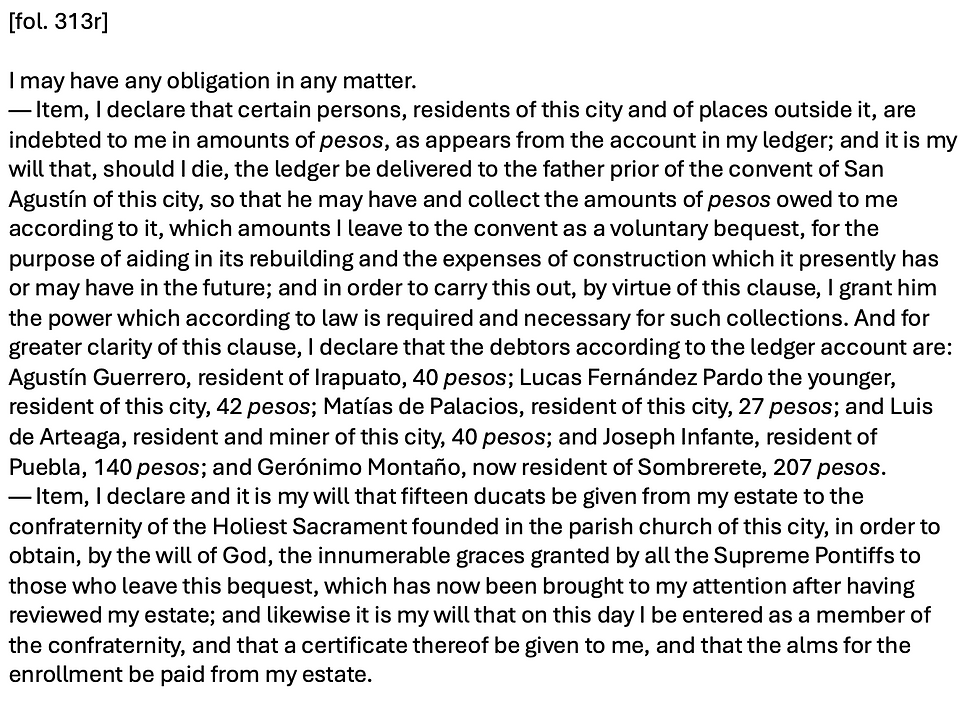 Juan also owned three slaves, one of which he was in the process of selling to Tomás Hernández, having received partial payment. He also noted a number of debts he was owed by various people in Zacatecas, Sombrerete, Irapuato and Puebla. Judging by the debts owed, it appears he made a living primarily from money lending.